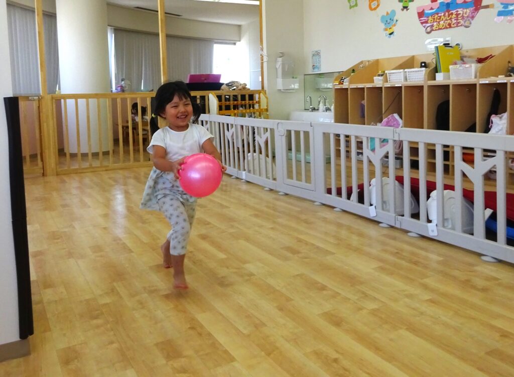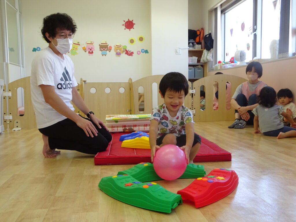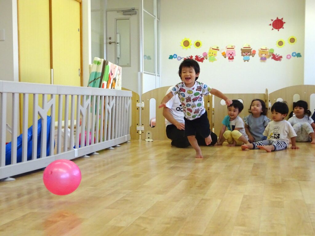 最初にしゅう先生がコロコロと転がしたボールを追いかけます!