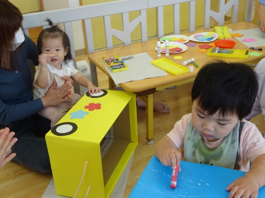 パパ、ママと一緒に飾りを貼ったり、クレヨンでお絵描きしてステキな車を完成させました✨