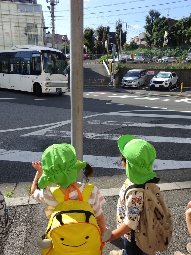 元気に横断歩道を渡ってバス停へ🚌