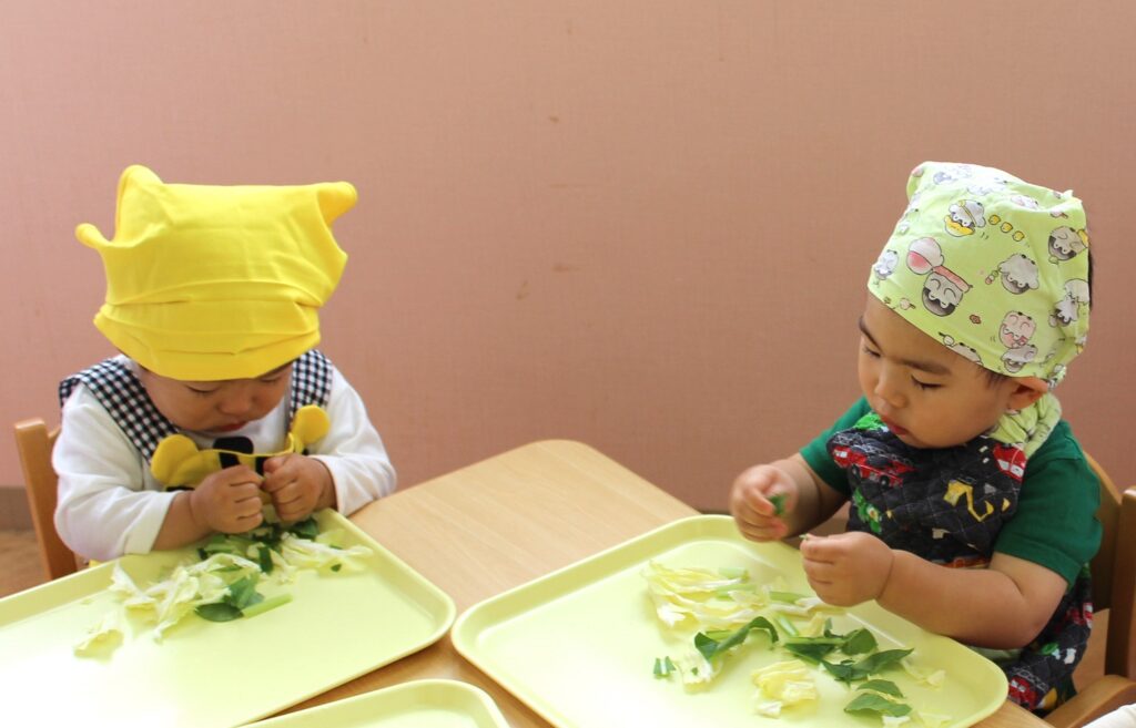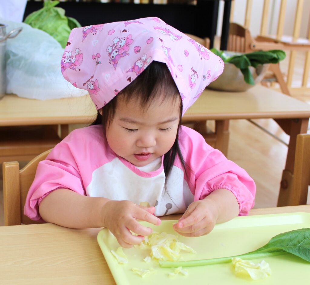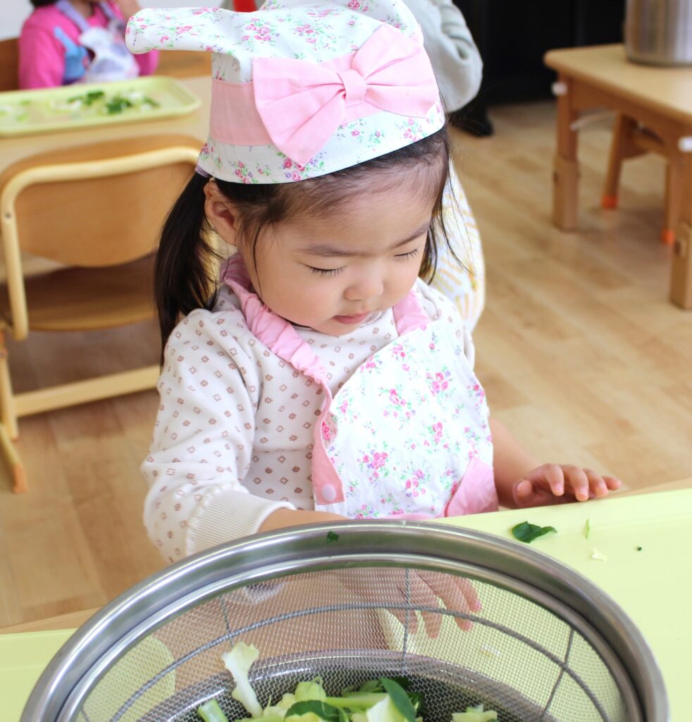 小松菜の茎がちょっと難しかったけど、「おいしくなーれ💓」の気持ちで上手にできましたね!素晴らしいです👏