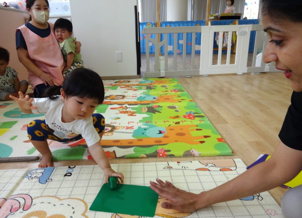 始めに色を教えてもらいました。『green』『red』『blue』発音は難しいようですが、色を見て同じ色の野菜をカードに置きました。