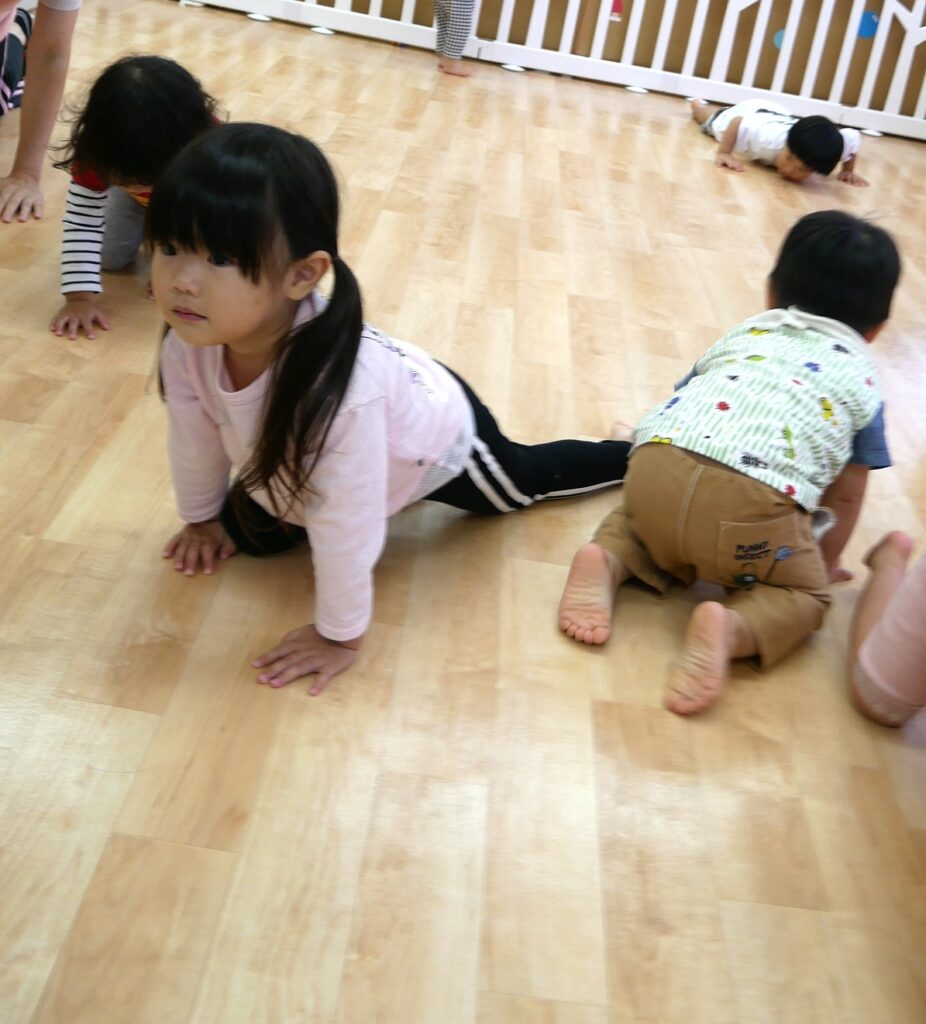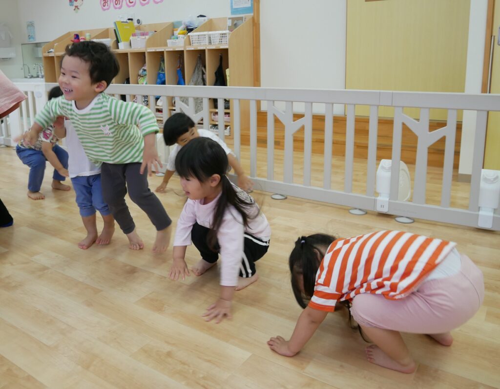 次は、全身を使ってカエルさん、カタツムリさんになってみました!
