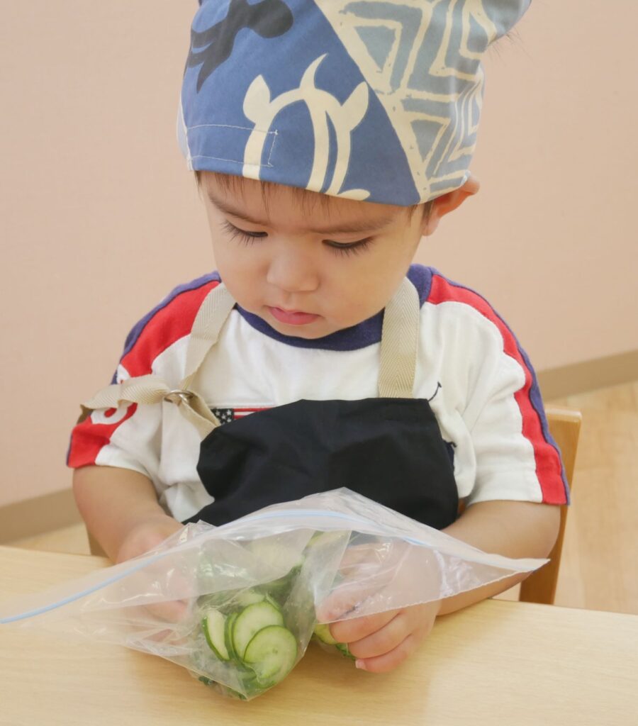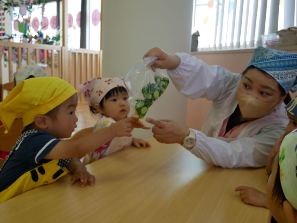 オレンジ🍊・パイン🍍組さんの7月の食育は、旬のきゅうりの塩もみ🥒と、とうもろこし🌽の皮むきを行いました✨