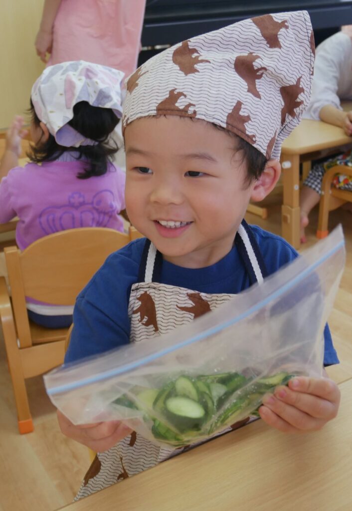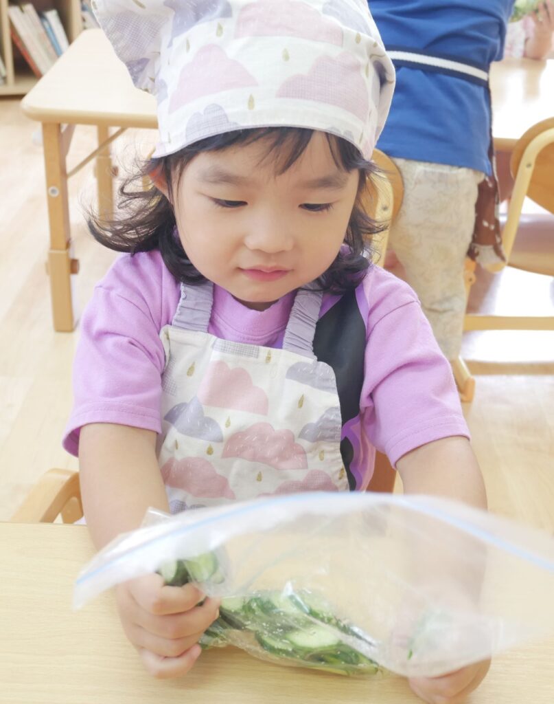みんな一生懸命きゅうりをもみもみしているね🥒
