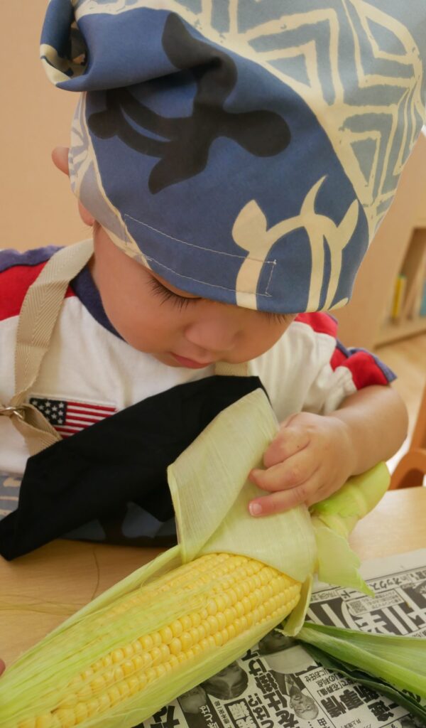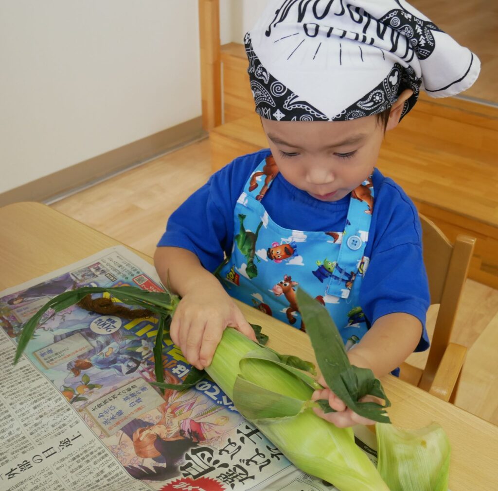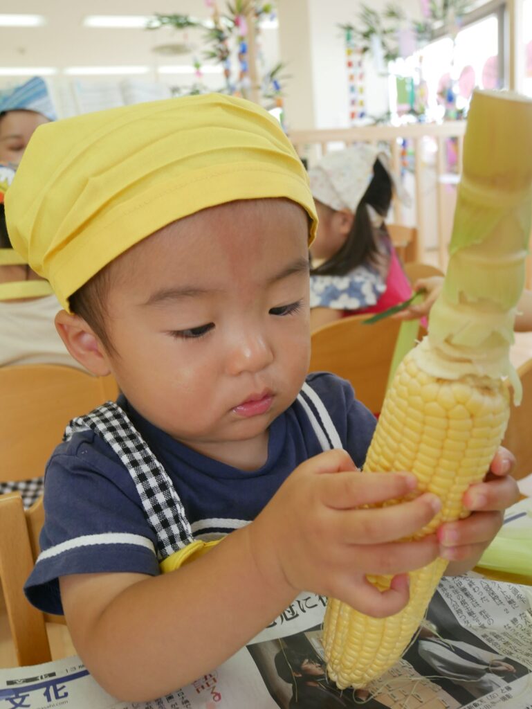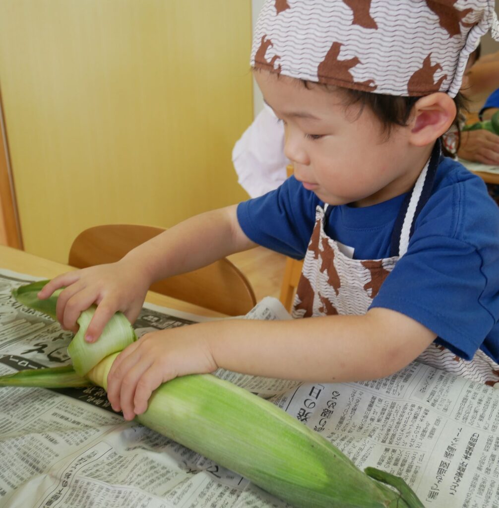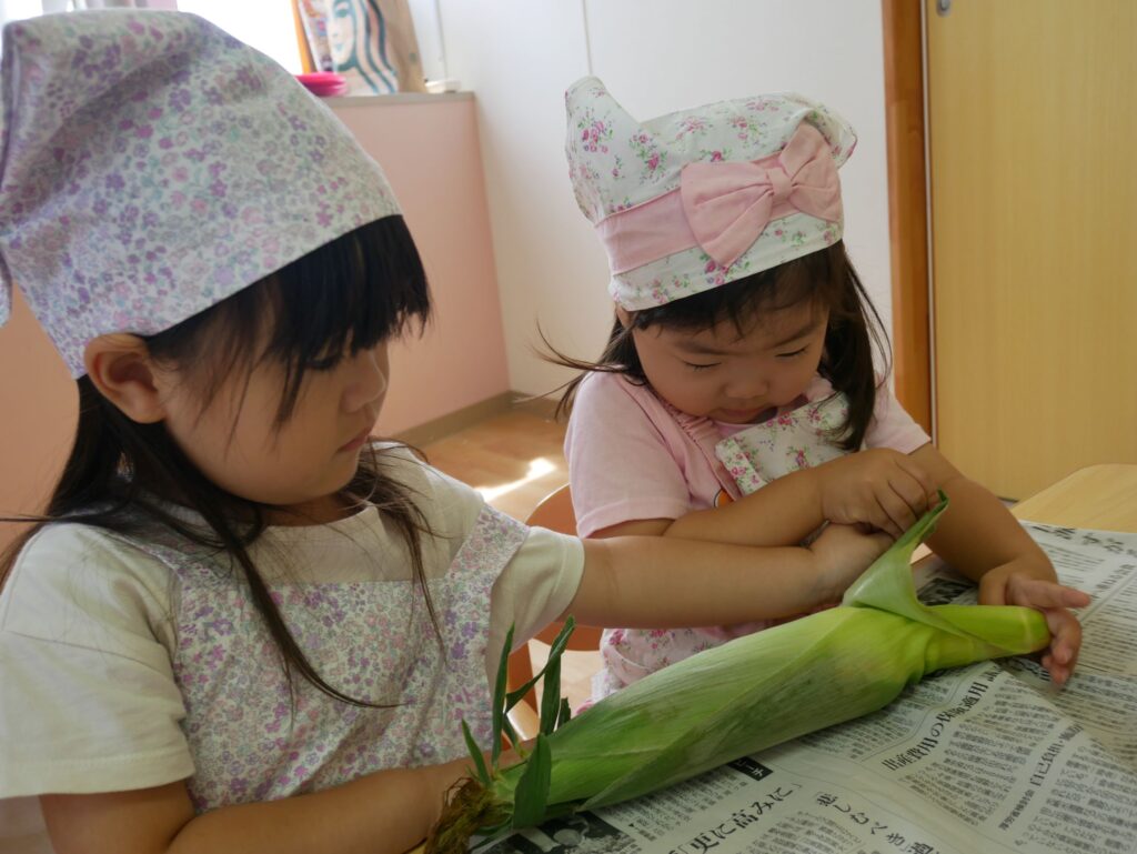 みんな力いっぱいに、お友だちや先生と一緒にとうもろこしの皮むきをすることができました😊🎵