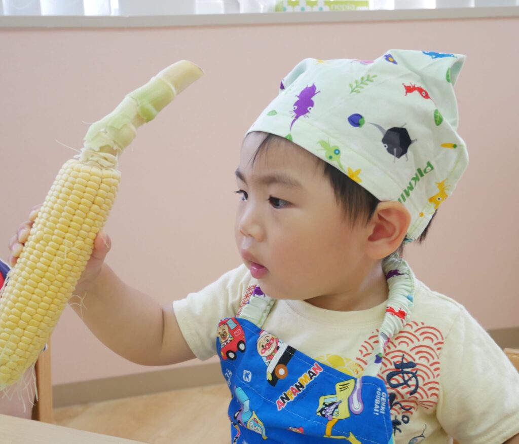 みんながいつも見ているとうもろこしとは違って緑色の皮に包まれているので、なんだろう💭とじっと見つめているお友だちもいましたよ!