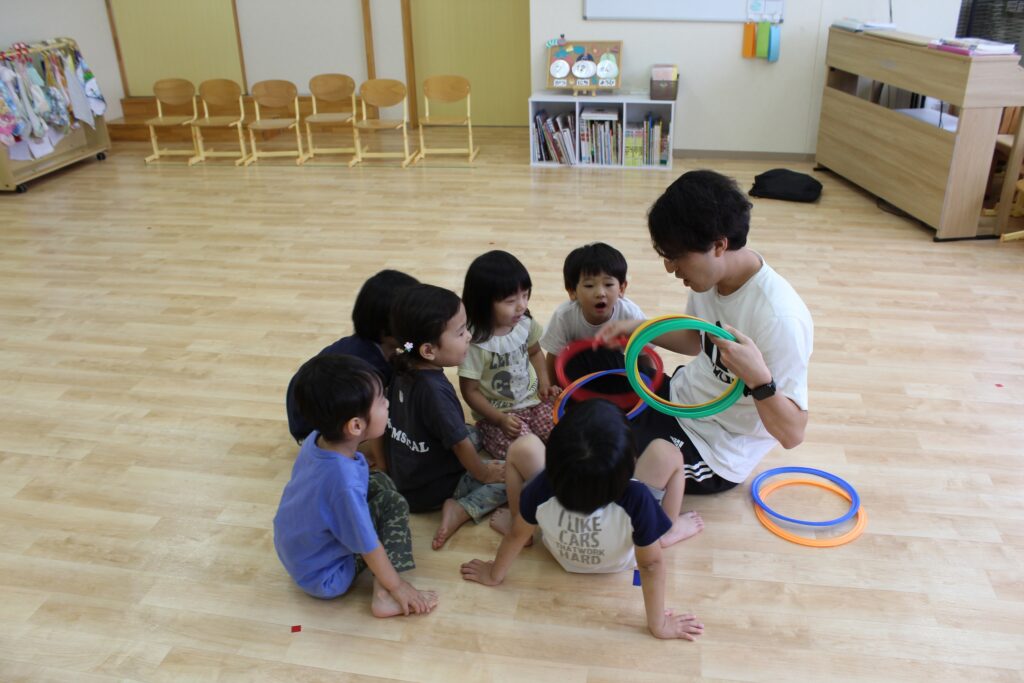しゅう先生が隠した5色の輪っかをみんなで協力して探します。