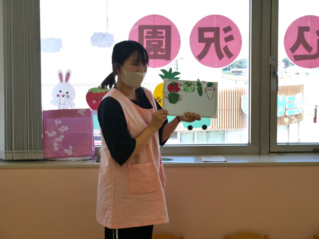 やさいの歌に合わせてホワイトボードシアターで色んな野菜を見て楽しみました!