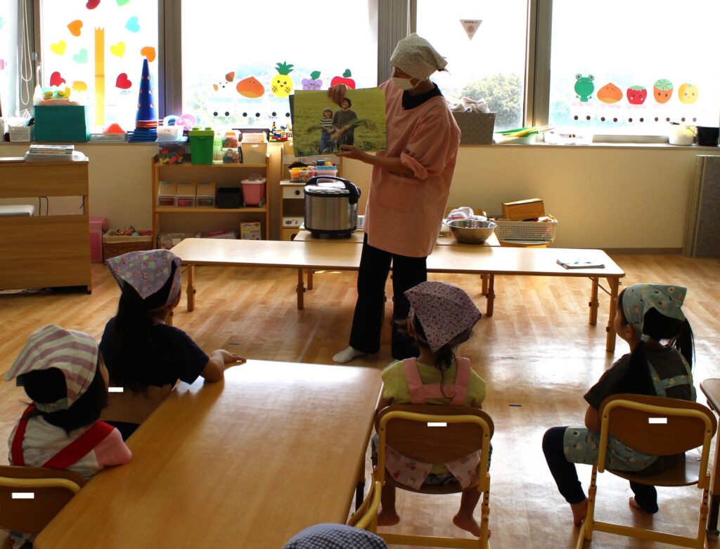 写真を見ながら白いお米になるまでのお話や、お米からできている食べ物はごはん以外に何があるのかなというお話をしました😊