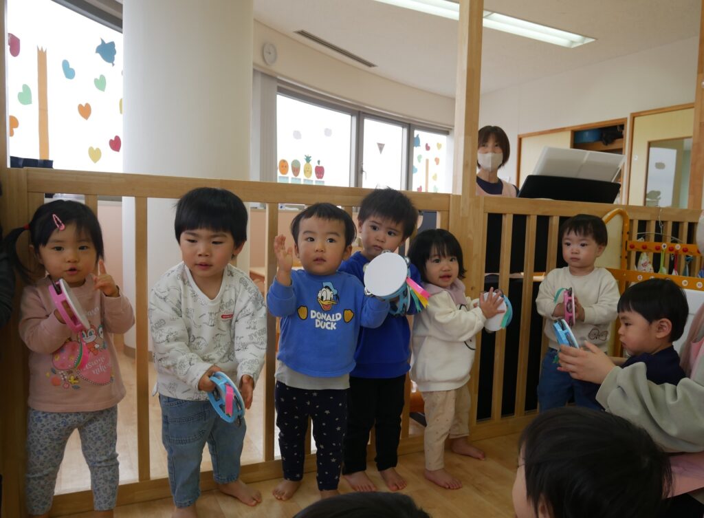 今月の楽器遊びは『コンコンクシャン』の歌に合わせてタンバリンをならしました♫