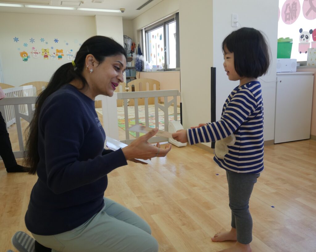 ちょっぴり恥ずかしそうにしながらも「Here you aye」と言えるようになってきましたよ👏