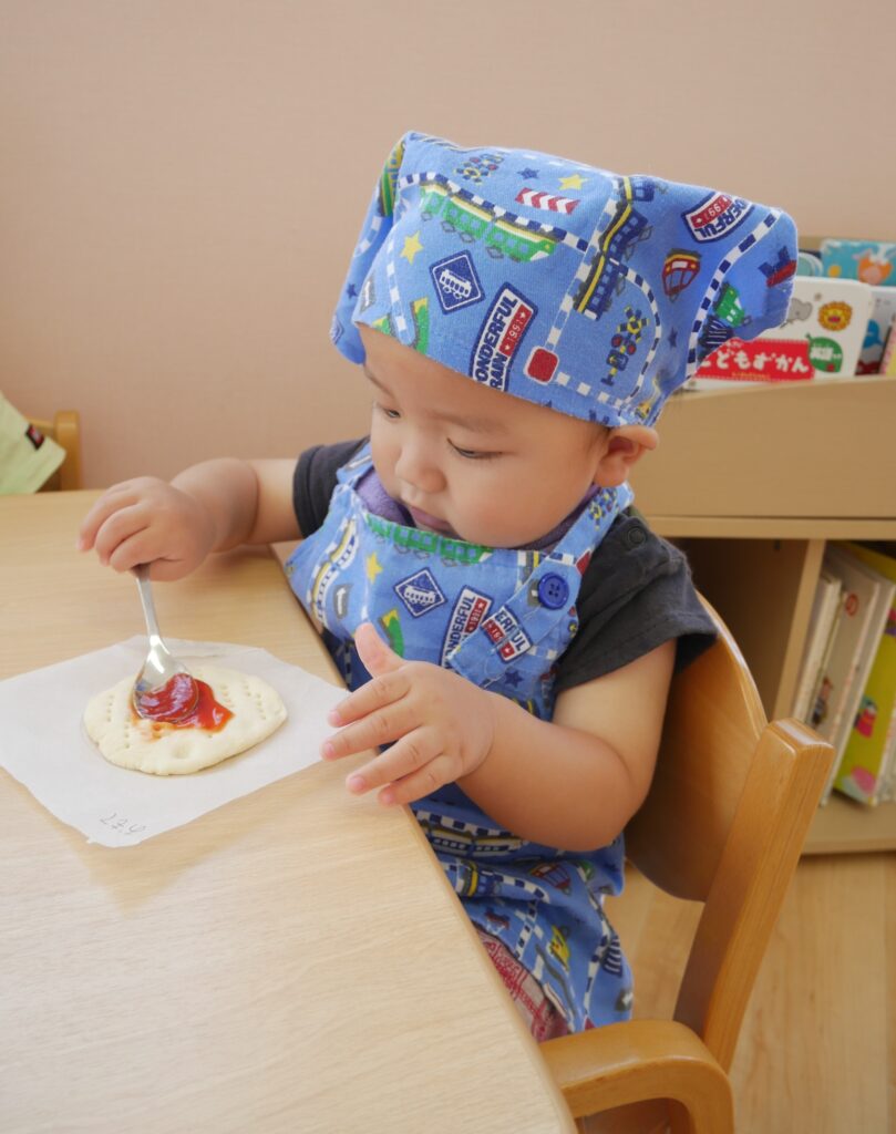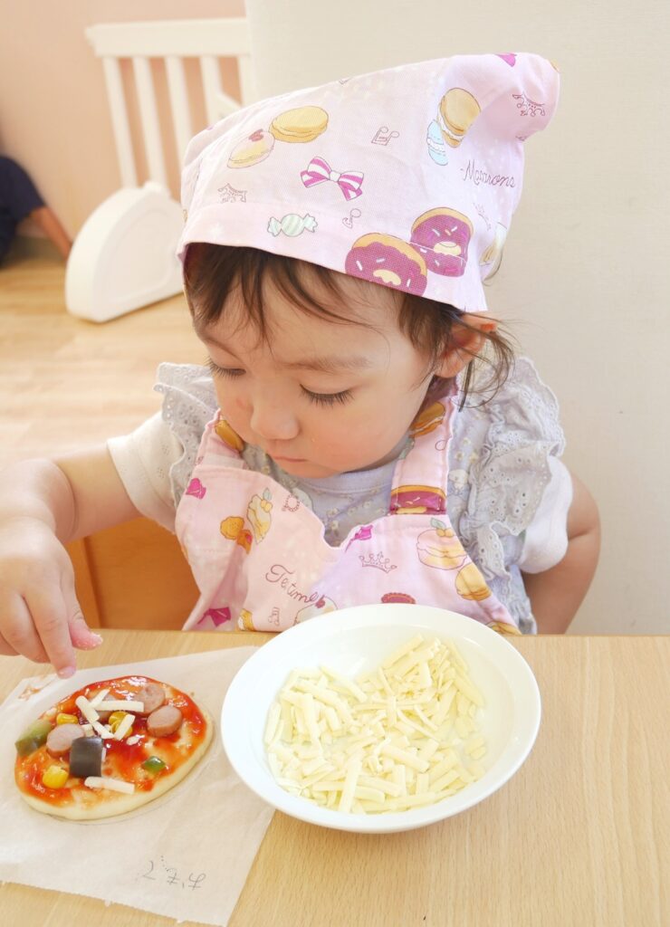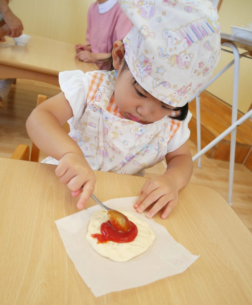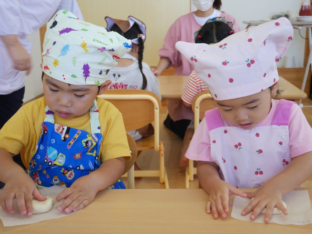 生地の形を作る所からやってもらいました!「手のひらでぎゅーと押して丸を作ってね」とお話するとみんな上手に生地を押していて綺麗な丸い生地が出来上がりました✨