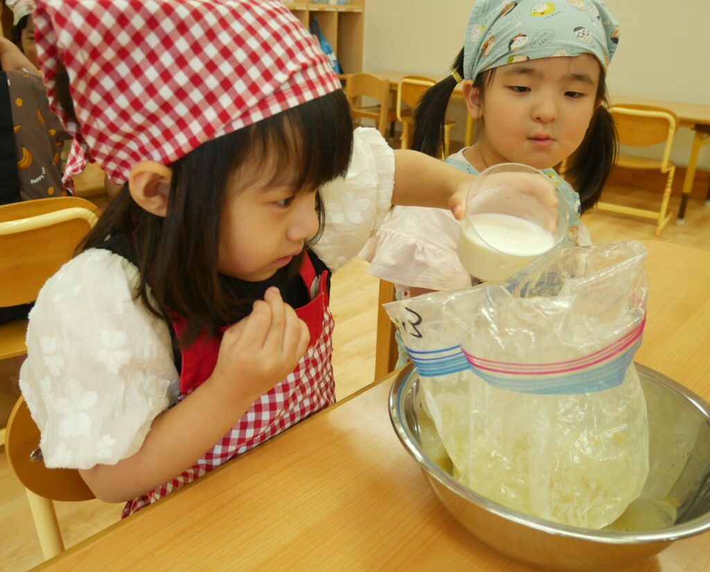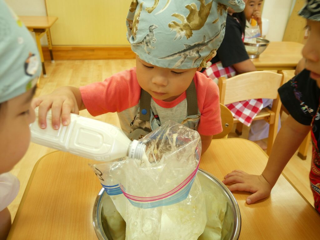 そして、袋に牛乳とふりふりした生クリームを入れましょう😊こぼさないようにそーっとね😊