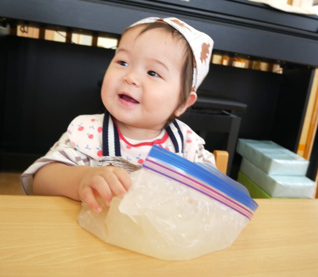 さっそく袋に入ったゼリーをクラッシュ!!かわいいお手てでにぎにぎしましょう✊✊