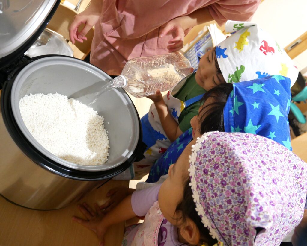 給食の先生と炊飯器に水を入れ、スイッチオン👆おいしく炊けますように✨