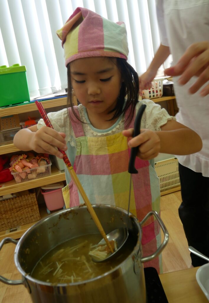 きのこに火が通ったら、お味噌をとき入れます!お玉とお箸を使ってとっても上手でした👏さすが大きいフルーツ組さん✨