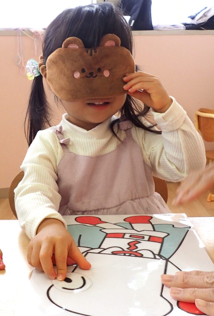 何も見えなくてちょっぴりドキドキしている様子でしたが、目隠しを取って出来上がった作品を見たときの子ども達の表情がとっても可愛かったです😍