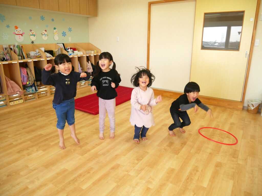 最初は難しそうにしていましたが、コツを掴むと手足を上げたり下げたりしながら、隣のお友だちにフープを渡すことができました👏