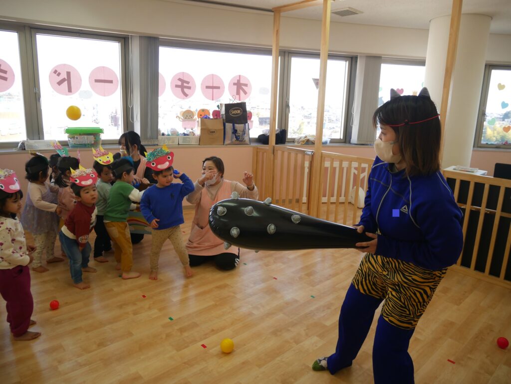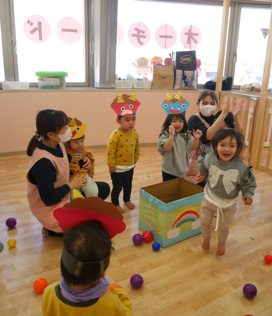 「うわあ鬼だ~👹」「怖い~😢」と怖がりながらも、「おにはそと!ふくはうち!」とボールを一生懸命当てて、みんなで協力しながら2体の鬼を退治しようと頑張っていたフルーツ組さんでした✨