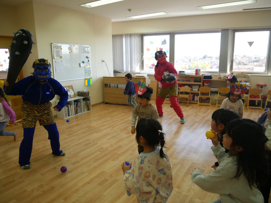 豆まきが初めてのキウイ組さんも先生に抱っこしてもらいながら「えいっ!」とボールを投げて鬼退治を頑張っていましたよ!