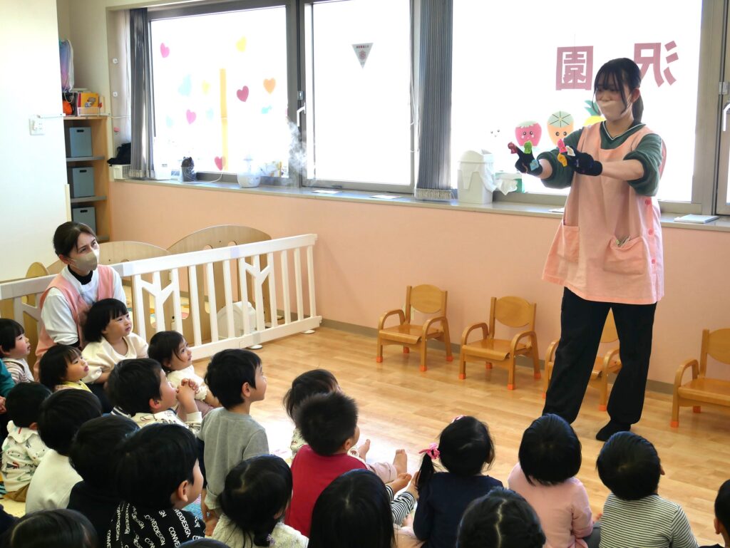 最初は「ゆびにんじゃ♫」の手袋シアターを行いました😊