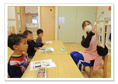 さらに教材を用いて、数量、文字についても身に着けていきます。まずはしっかりとした筆圧で線を書く運筆から始めていきます。そこから文字や数字を書く練習にステップアップしていきます。修正が難しい書き順にも注意して書くことを心がけています。 小学校入学前までにひらがなで絵本が読めることを目標に進めていきますが、ひとりひとりの進度を担任が把握しているので、集団の中でもお子様に合った無理のない進度で行っていきます。