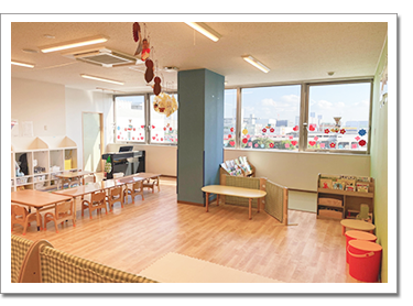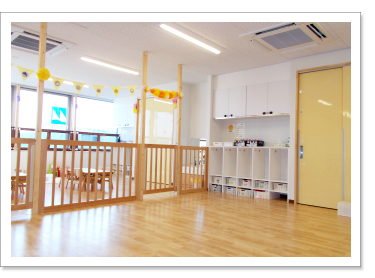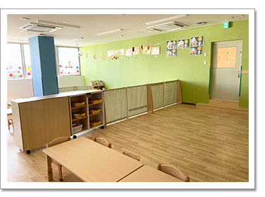 3歳以上児室です。広々としたお部屋に絵本コーナー、製作コーナー、おままごとコーナーなどをもうけ、自主的に遊びを選びとれる環境設定を行っています。